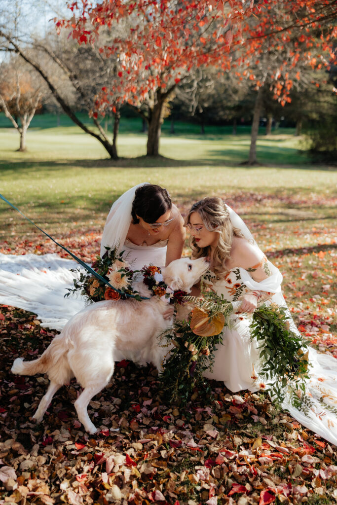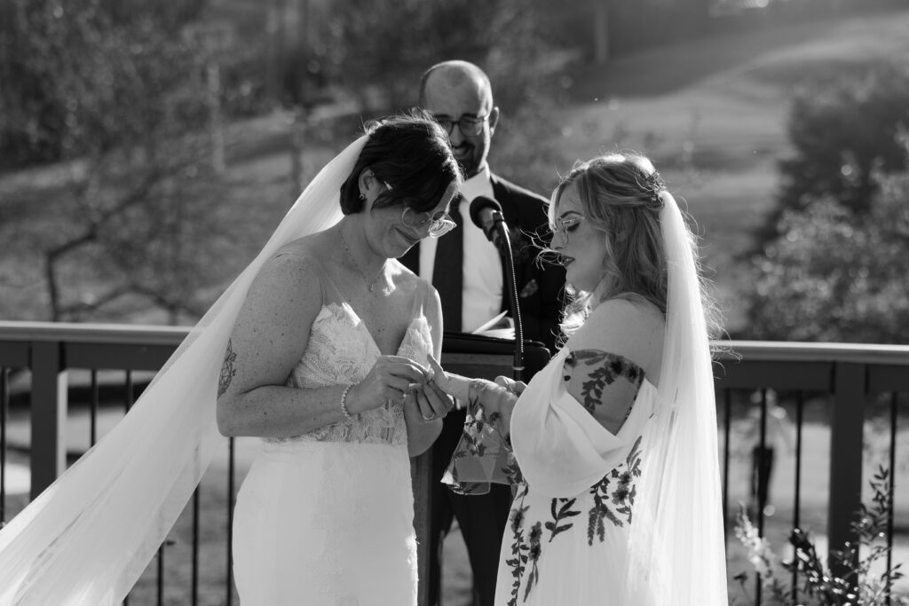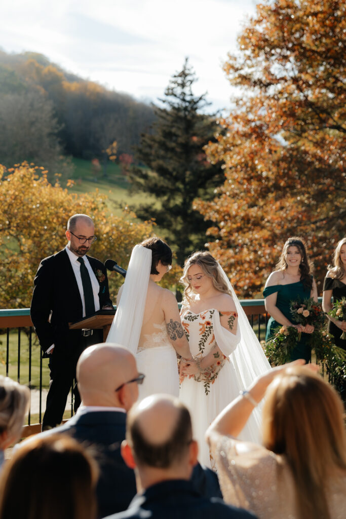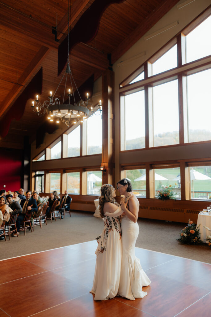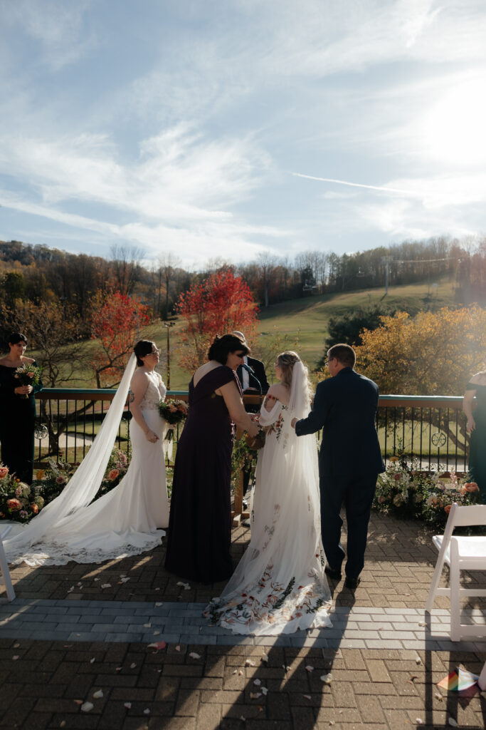 The ceremony took place at the Overlook at Holiday Valley, glowing and golden in the late afternoon. Both brides were walked down the aisle by their parents, offering both emotional and physical support. The ceremony was unhurried and deeply grounded in their love story, the love of their people, and the love of their sweet dog, of course.