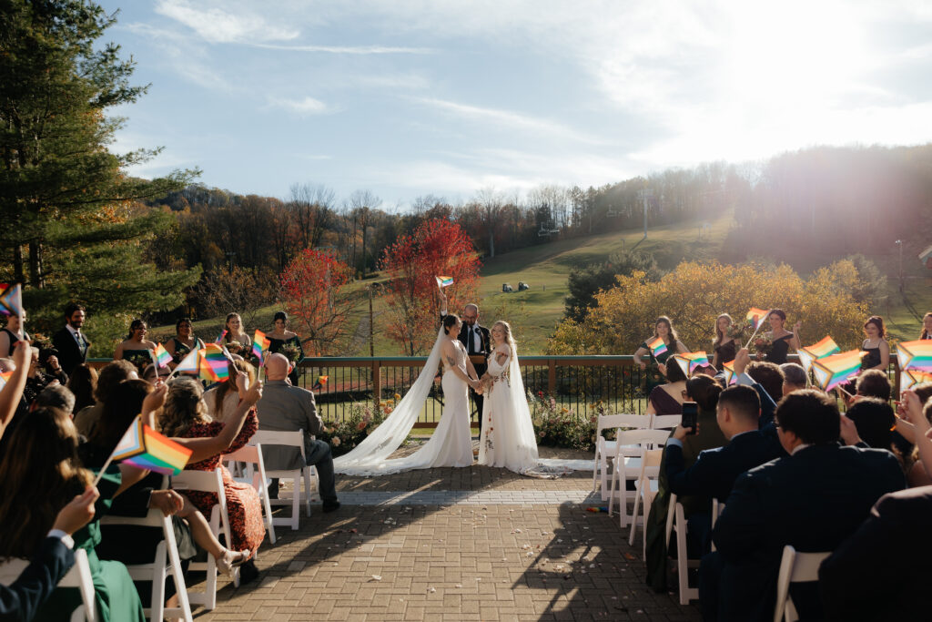 When Angela and Jess were pronounced married, they walked back up the aisle to planned pride flags waving, celebrating love and visibility.