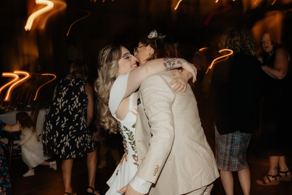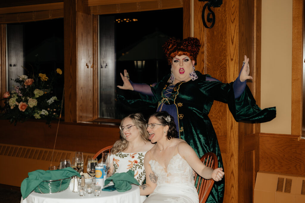 The emotion-filled reception turned wild and celebrant, kicking off with a Hocus Pocus themed drag performance, and incredible dance floor energy- energy that surrounded Angela’s vibrant dancing, energy that supported Jess during her turns on the dance floor, and energy that concluded the night perfectly: loudly and proudly supporting Angela, Jess, and their love for each other, their experience, and their people.